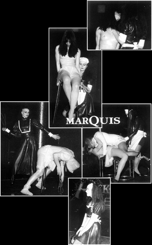 Downstairs Hidebound and Roissy were kept extremely busy with a large array of furniture and toys. They were also busy helping people act out some of their fantasies. At times the downstairs room was packed almost wall to wall with people playing and experimenting with various toys and pieces of equipment. No matter what happened elsewhere in the club this room seemed to sink into its own little piece of reality, caring for many of the true fetishists, and even introducing many new people into our world.