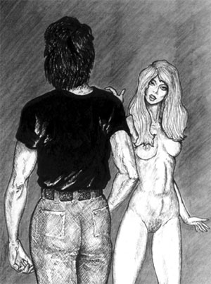 | “But I knew you would.” She stood up and turned towards the fountain, and my leather jacket fell to the floor. She bent forward and reached into the water to splash some onto her face and neck. Then she turned back towards me. “Well, prince charming, how does it feel to see your prize?” she asked, with a smirk across her face. Again, I looked straight into her eyes. My legs started to turn to jelly as I sank deeper and deeper in to those deep blue eyes. Then she turned away, releasing me. I staggered slightly as I recovered, from, what I don’t really know. Her long black hair fell down about her shoulders, covering the top of her breasts. She moved with such grace that she made no sound as she walked around. |