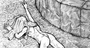 | As I moved round the fountain, I noticed a body lying on the floor. It was on the other side of the fountain, which is why I hadn’t noticed it before. I stepped forward, and saw it was a young girl. As I turned her over, I realised that she was totally naked. As I moved her she began to stir, I took off my leather, and wrapped it around her shoulders, as she started to sit up. |