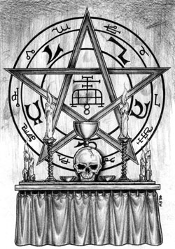 The cave room was relatively large, with four other entrances running off in various directions. It had an altar at the far end, with a human skull in the centre, with a large golden goblet behind it and two candles either side. There was a candelabrum either side, each holding twenty candles. Above the altar was a pentagram carved into the stone wall. On the other walls were various writings in old English, with a lot of runic symbols carved into the stone. Each wall had a picture telling of a different act of horror that the dead lord had committed. Either side the entrance way I was standing in was another candelabrum, the same as the by the altar.